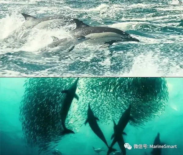 ▲在《海洋》中,长吻真海豚相互合作驱逐沙丁鱼群,将鱼群分割为一个个“饵球”。