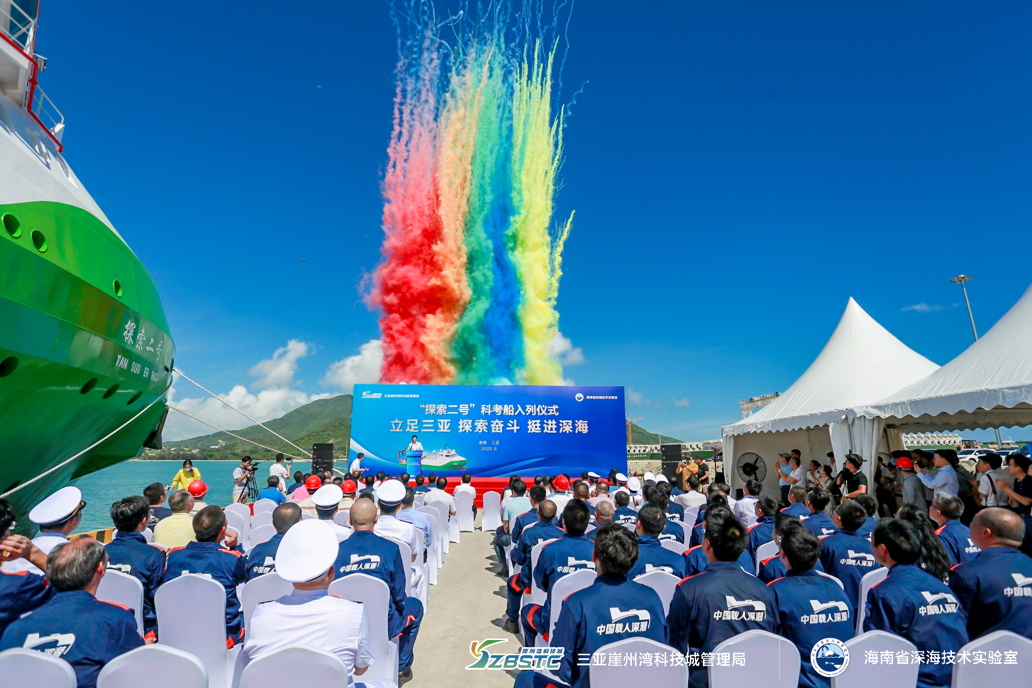 随后,在南山港码头,三亚崖州湾科技城为 “探索二号”举行隆重的入列仪式,船舶增改项目负责人唐古拉山向海南省人民政府副秘书长赖泳文汇报:“探索二号”船完成改建研制工作,回到三亚,正式入列。赖泳文首先表示同意入列,并代表省政府,向奋战在“探索二号”科考船改建一线的科技人员们表示衷心的感谢,赖泳文指出:“探索二号”的正式入列,将推动海南逐步形成“双船双潜器”为主、系列无人深潜装置为辅的深海科考重大装备集群,在全世界海洋科技领域占据极为重要的位置。他希望我们在全力保障国家战略需要的同时,落实科技资源共享要求,继续加大支持深海战略产业发展,他指出:海南将一如既往地支持深海科技创新活动,保障全海深载人潜水器海试和科考任务,助力深海所在深海领域登攀高峰。海南省科学技术厅党委书记国章成出席仪式并致辞,他也对“探索二号”的正式入列表示欢迎。