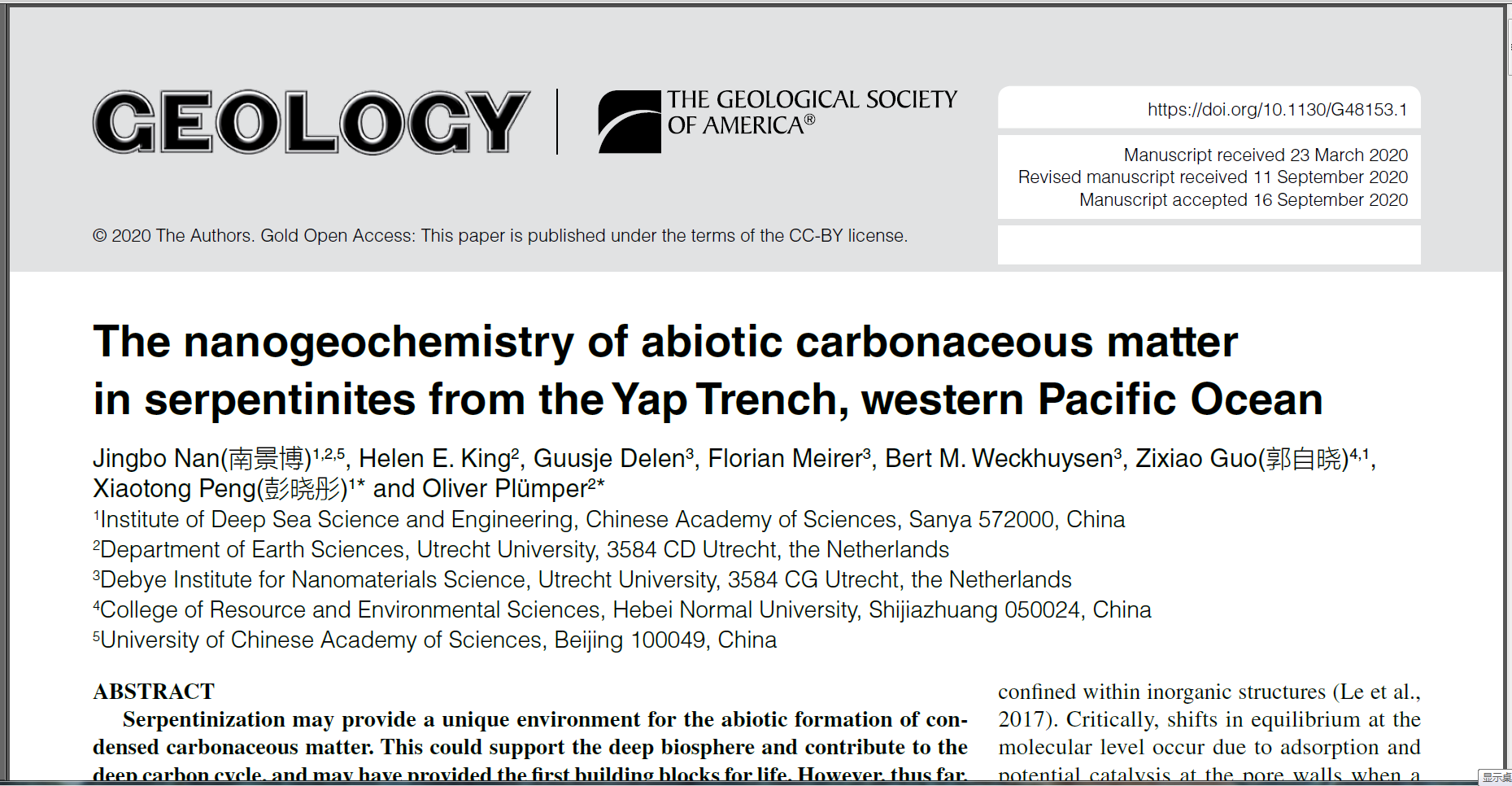 该项研究近期在线发表于地学权威期刊《Geology》,论文第一作者为深海所博士研究生南景博,彭晓彤研究员与乌得勒支大学Oliver Plümper博士为共同通讯作者(Nan, J., King, H.E., Delen, G., Meirer, F., Weckhuysen., B.M., Guo, Z., Peng, X.*, and Plümper, O.*, 2020. The nanogeochemistry of abiotic carbonaceous matter in serpentinites from the Yap Trench, western Pacific Ocean)。