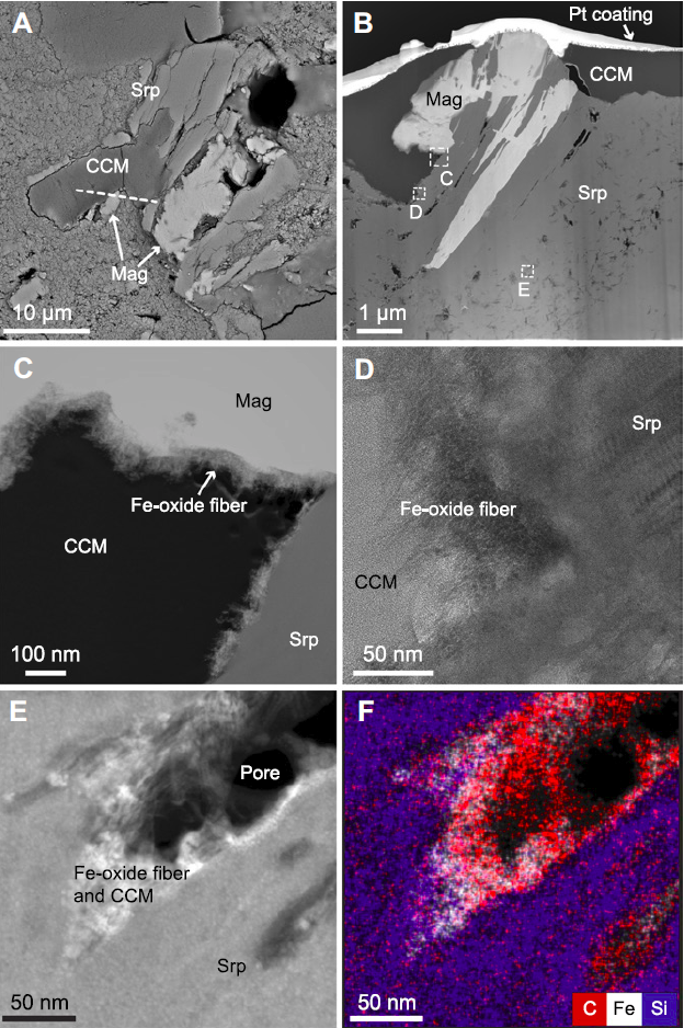 非生物成因有机质(CCM)与铁氧化物及蛇纹石(Srp)纳米孔的空间关系