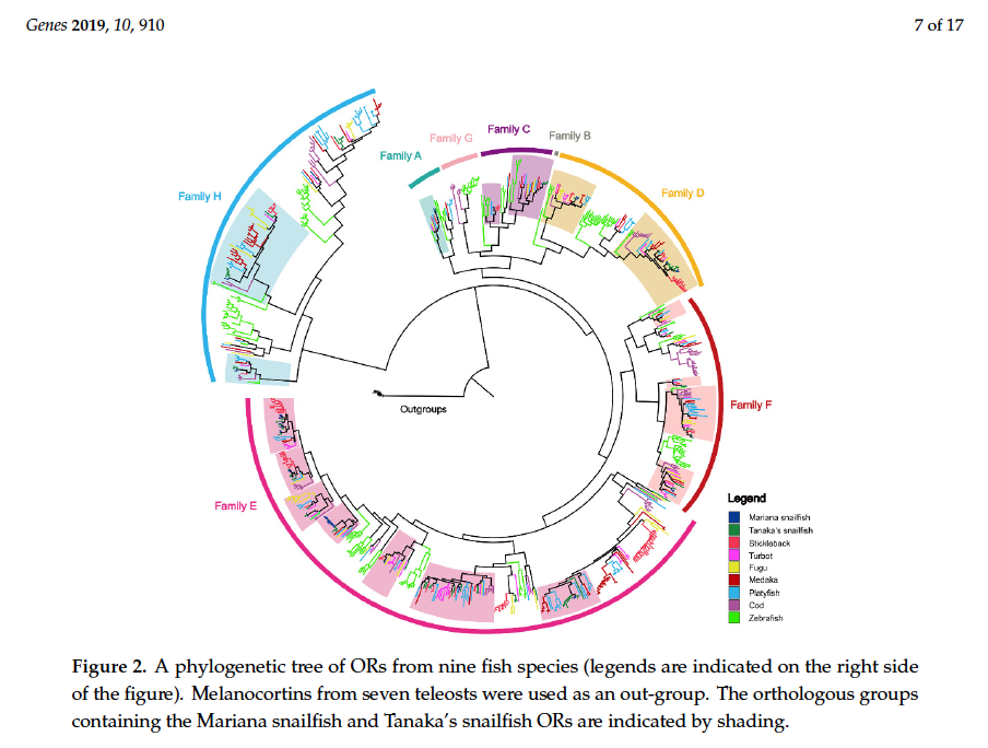动物的嗅觉基因家族的进化与其生存环境下的生态需求紧密相关。例如,嗅觉功能基因的数目的改变与水生和陆生环境的不同、食性的转变、功能依赖性的改变等密切相关。马里亚纳狮子鱼可以迅速的被投放的诱饵所吸引,表明其嗅觉在觅食中具有重要的功能。其在深渊的生态环境中属于捕食者,位于食物链的顶端,但在物种丰度和数量贫乏的深渊环境中,其专一的以少数几种甲壳类生物为食。另外,由于生存在黑暗无光的环境,其视觉能力发生了褪化。因此,马里亚纳狮子鱼对嗅觉功能的依赖性既可能会由于特化的专一性食性而减弱,也可能会向补偿视觉的退化而增强方向发生适应性进化。