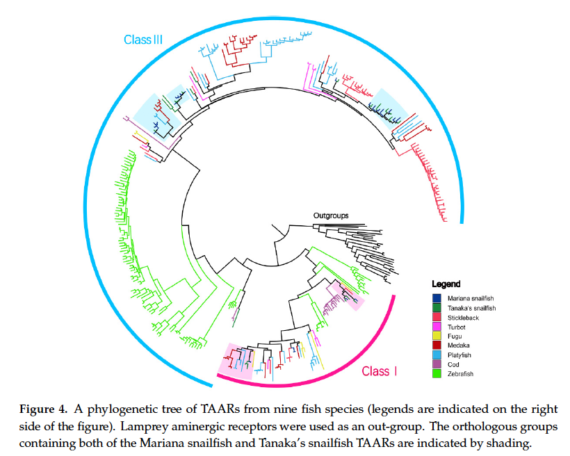 为了探讨上述科学问题,中科院何舜平研究员团队查找并注释了9种鱼类的嗅觉受体(OR)和痕量胺受体(TAAR)基因家族,并重点对比马里亚纳狮子鱼与其浅海近缘物种细纹狮子鱼之间的差异。研究发现马里亚纳狮子鱼的OR基因家族发生了大量的丢失,并伴随着很高比例的假基因化。而TAAR基因家族基因的数目变化不大。系统发育分析结果表明,马里亚纳狮子鱼和细纹狮子鱼嗅觉基因家族的组成高度保守。同细纹狮子鱼相比,马里亚纳狮子鱼OR基因家族的亚家族数量相近,但每个亚家族中的OR基因数目明显减少,而TAAR基因家族的亚家族数目发生减少,但亚家族中的TAAR数量增加。尽管马里亚纳狮子鱼OR亚家族普遍是收缩的,仍发现有个别亚家族发生扩张,这种亚家族间独立的进化历程反映了不同OR亚家族基因在深渊生态环境中面临独立的选择压力。进一步的进化选择压力的分析显示,OR基因在马里亚纳狮子鱼中发生了松弛选择,其功能依赖性降低。而TAAR基因则受到正选择作用,这表明TAAR基因在马里亚纳狮子鱼适应深渊生态环境中仍具有重要的作用,符合其能够迅速感知动物腐败后释放的胺的现象。这项研究首次揭示了马里亚纳狮子鱼在占据深渊环境中嗅觉发生了简单但专一的适应性进化历程,为进一步了解深渊中生物的生态适应提供了重要的基础和见解。
