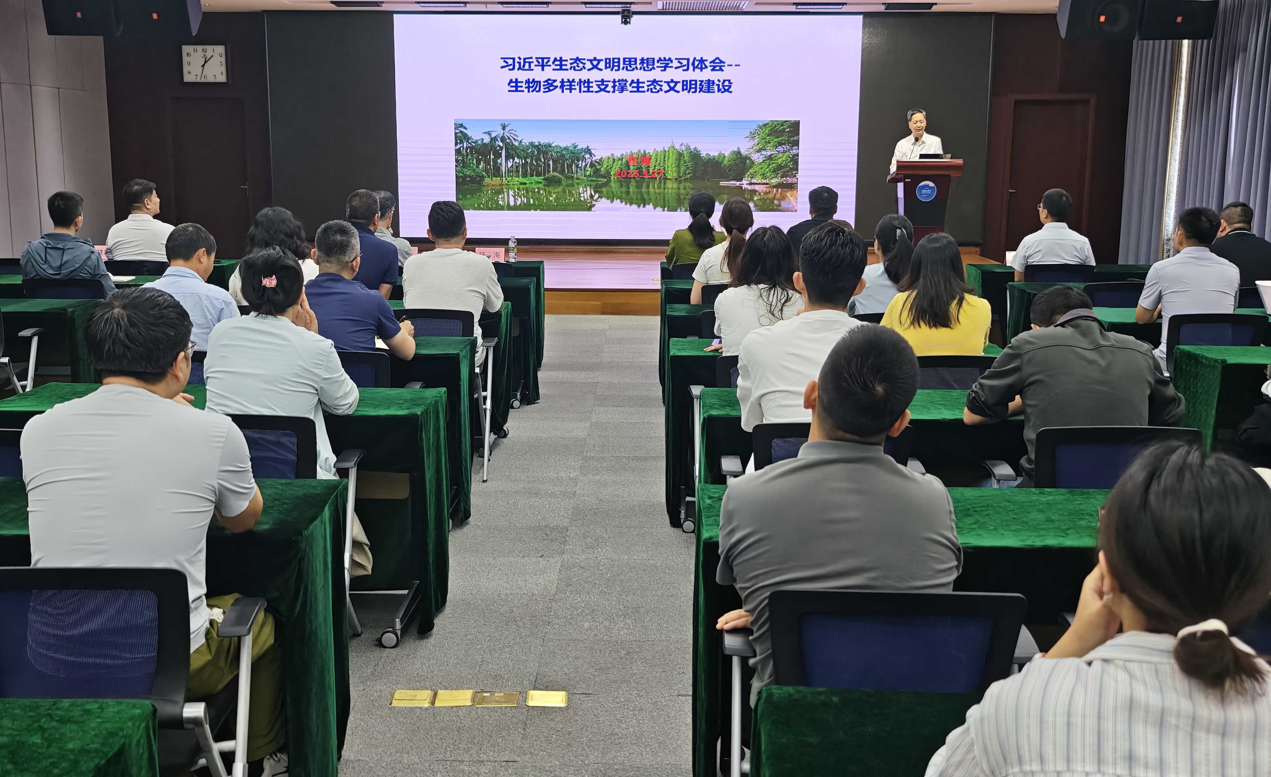 任海结合长期从事植被生态恢复研究的实践与思考,围绕习近平生态文明思想、生物多样性、生态服务与生态文明、经济植物利用与绿色发展等四个方面,系统阐述了生态文明思想的深刻内涵与时代价值,报告视野宏阔、内容丰富、见解深刻,兼具理论高度与实践深度,现场学习氛围浓厚。
