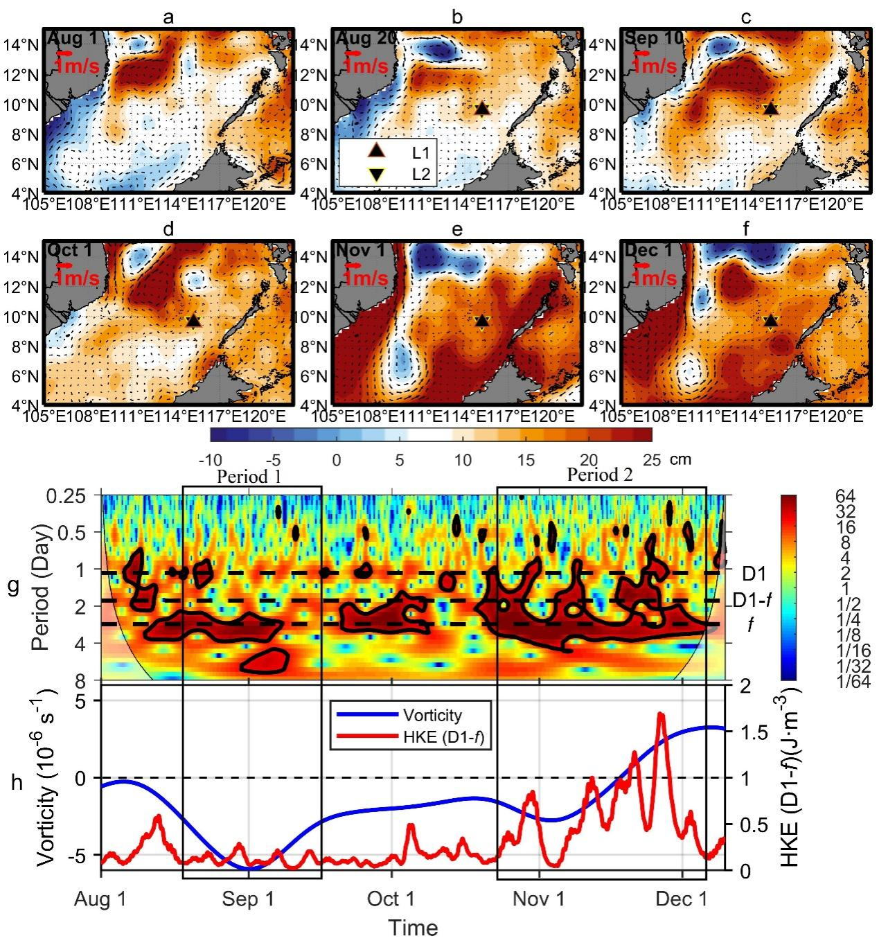 图1. 观测期间南海南部海表高度异常和地转流场分布(a-f),235米深度径向流速小波能量谱(g),235-350米深度垂向平均涡度(蓝线)和D1-f内波HKE(红线)时间变化(h)。