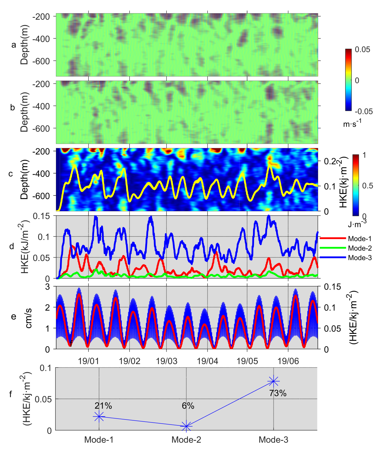 另外利用南沙海域2018/2019年的锚系潜标数据,研究团队还研究了该海域内潮和近惯性波的垂直分布和时间变化。研究结果表明,内潮主要以O1K1M2分潮为主,其中全日内潮最强,其次半日内潮。与前人的研究发现不同南沙海域的全日内潮主要mode-3模态主导,而不是以前认为mode-1模态(图2)。半日内潮的水平动能mode-1模态为主,受背景环流场影响。在冬季风期间,由于强风强迫,近惯性能量振幅较大。此外,由于近惯性内波的遥强迫,近惯性能量在当年的3月中旬至4月初达到峰值。总体而言,该海域的近惯性能量主要集中在500-600米深度以上。 相关研究成果已发表于国际知名海洋学期刊《Frontiers in Marine Science》。
