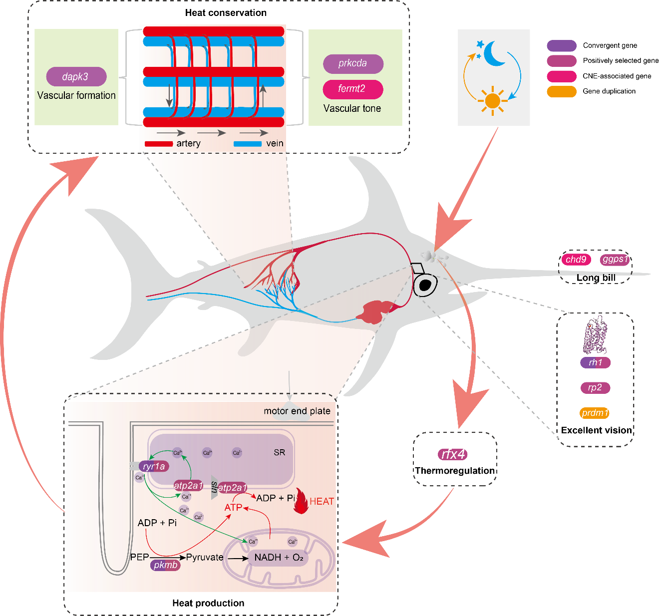 为了应对水体快速散热的特点,水生恒温动物通常具有一个独特的逆流交换器,用于温度的保存和传递。剑鱼和旗鱼中存在着由动脉和静脉血管平行排列,血流方向完全相反的血管网络系统。在对剑鱼和旗鱼的同源基因分析中,发现存在着9个显著受到了正选择的基因,其中有三个基因 (dapk3, prkcda和rfx4) 的存在较大的氨基酸改变。其中dapk3是脊椎动物动物平滑肌收缩调控的重要因子,该基因可能参与了血管网络的形成;prkcda是调控血管张力的重要基因,该基因可能促进了逆流交换器更好的实现热量的保存和传递。而Rfx4高表达于哺乳动物视交叉上核,对昼夜变化和温度刺激具有调控作用。剑鱼和旗鱼中该基因的显著改变表明视交叉上核可能对它们也具有关键的调节作用。